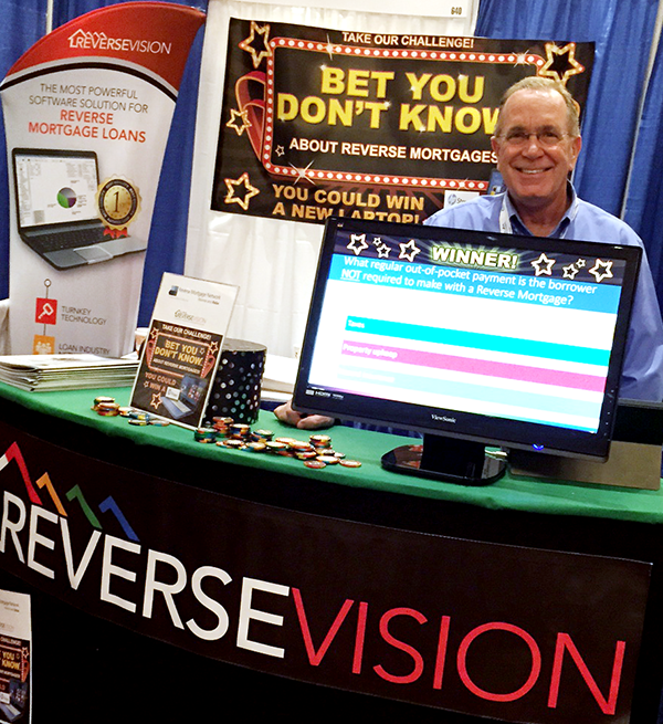 In order to capture the interest of lenders and brokers in the forward space we challenged their intellect (and ego) by "betting" them they "don't know what they think they know about reverse mortgages." This campaign proved to be incredibly successful! We set up a multiple choice quiz with about 30 questions and displayed one at a time on a large monitor. Then, we challenge attendees to take our bet. Once engaged, most people learned something and became very interested. We generated 50-60 warm to hot leads per show that we shared with our lender/booth partner.